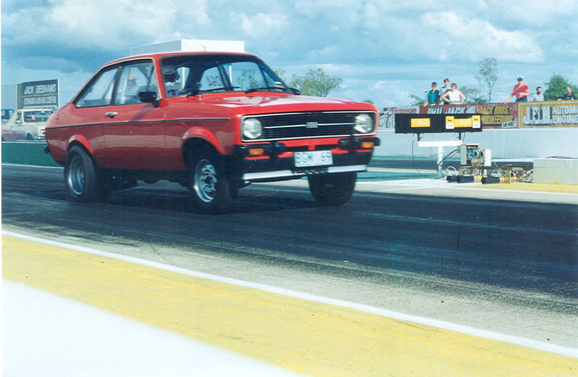 Peter Taylors Mark 2 red escort. At the time Peter held the SSCC national drag record at 11.2 with this red escort. Then Brian fitted his his own 2lt draw through weber carby set up.